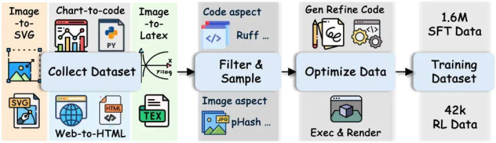 研究团队首先构建了一个包含 1.6M 图像 - 代码对的大规模监督微调(SFT)语料库 。该语料库不仅覆盖了直接代码生成任务,还引入 “视觉代码优化” 的新任务 。在这项任务中,模型会接收到一个目标图像和一个 “有缺陷” 的代码片段(包含逻辑错误或只能部分渲染)。模型的目标是修正这段代码,使其视觉输出与目标图像精确对齐 。这一设计极大地提升了模型在代码层面的纠错和优化能力,为后续的强化学习阶段奠定了坚实基础 。