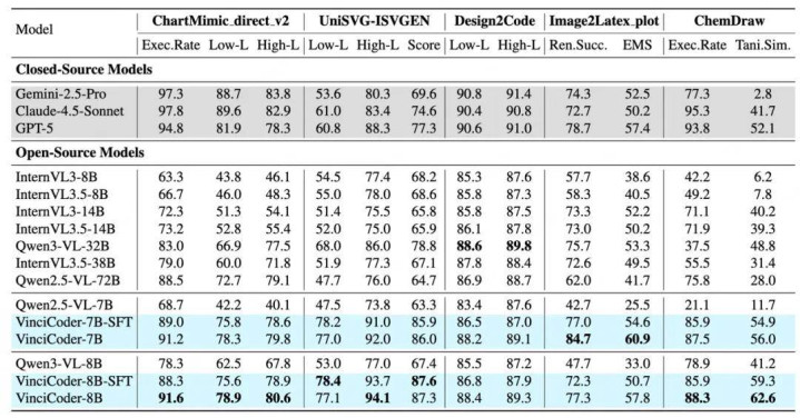 媲美闭源模型:在如 Image-to-SVG 和化学分子式生等高难度任务上,VinciCoder 展现出超越顶尖闭源模型的卓越性能 。
