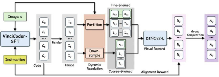 为解决此问题,VinciCoder 引入了视觉强化学习 (ViRL) 框架 。该框架摒弃了传统强化学习中脆弱的、基于规则的 “文本奖励” ,转而从视觉直接获取奖励信号 。