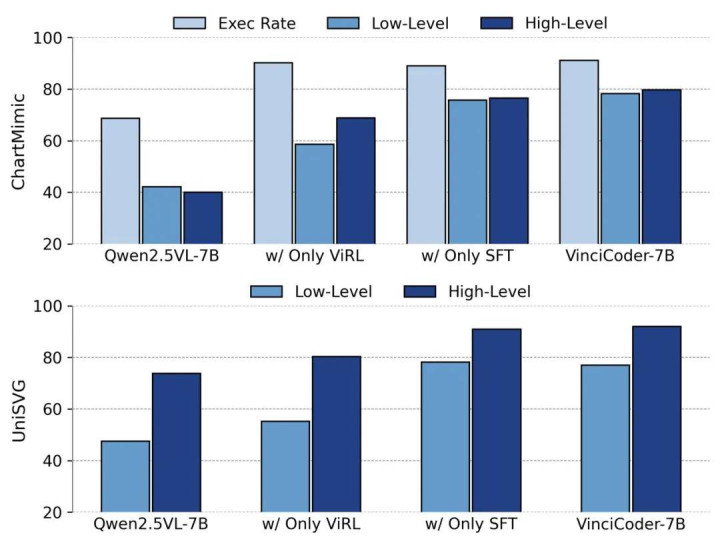 策略有效性:消融实验证明,仅 SFT 阶段的 VinciCoder-SFT 就已建立起强大的基线 ;而 ViRL 阶段的引入,则成功将模型性能提升至 SOTA 水平 ,充分验证了 SFT-ViRL 两阶段策略的压倒性优势。